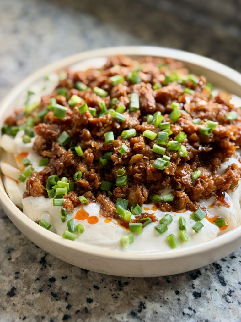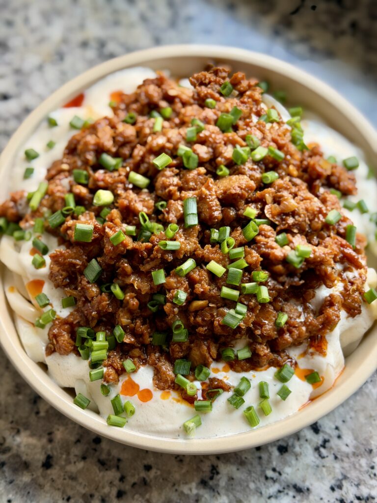 Mapo Tofu is a popular Chinese dish from Sichuan province & is traditionally made with minced meat, like beef. I first tried this dish at a Sichuan Restaurant and instantly fell in love. But this viral version consists of a stir fried version of minced meat – which is layered on top of thick, chewy udon topped with a creamy silken tofu sauce.