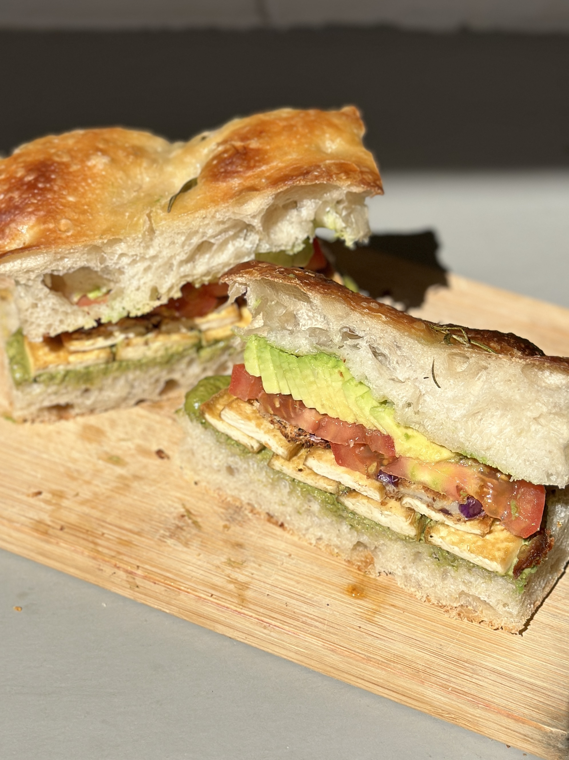 - Slice foccacia and spread vegan pesto, followed by pan fried tofu, crispy eggplant, tomatoes, sliced avocado and sun dried tomatoes. Enjoy!