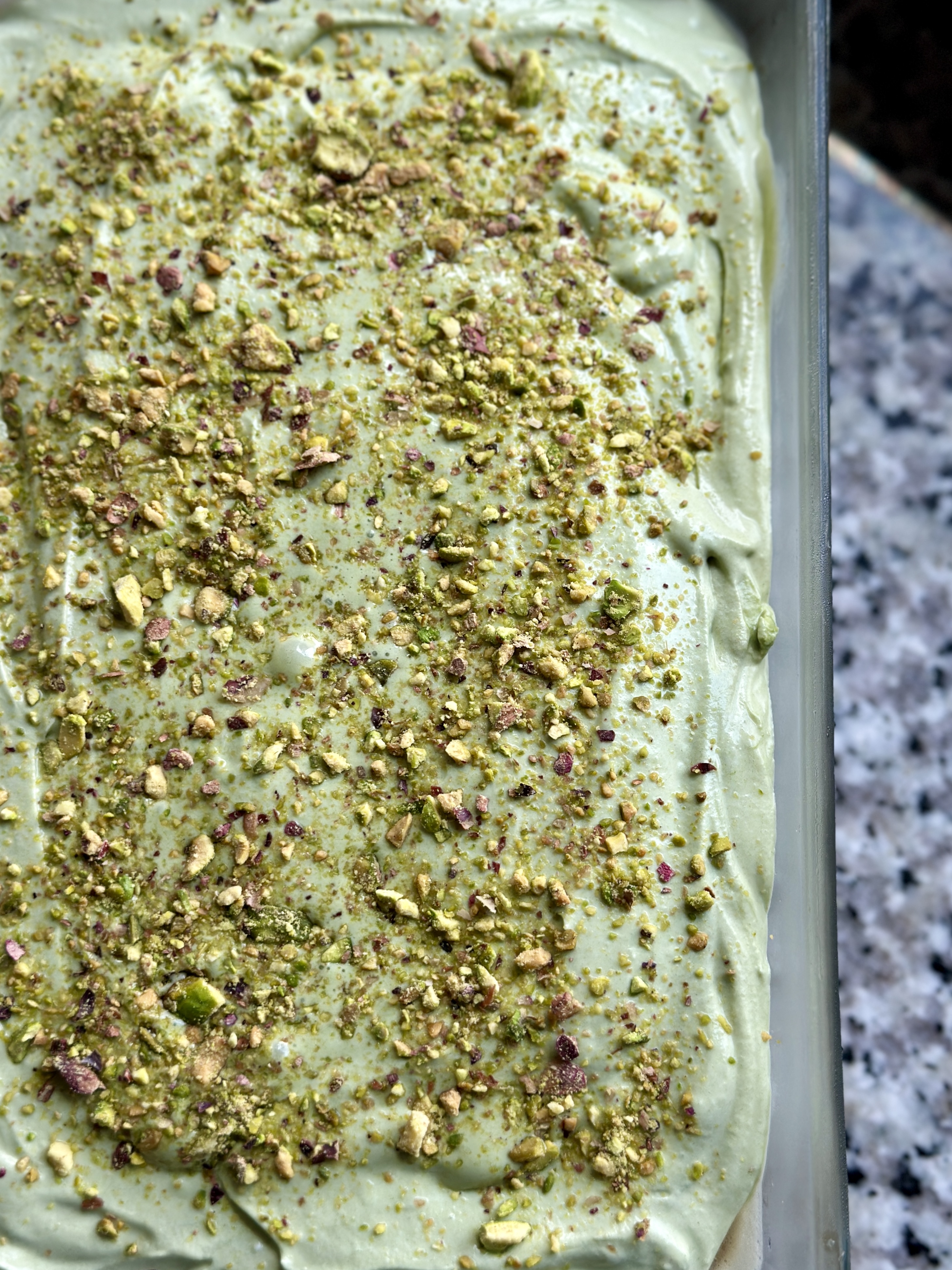 • Spread the whipped cream on top of the chilled cake. Garnish with chopped pistachios. Slice and serve cold!