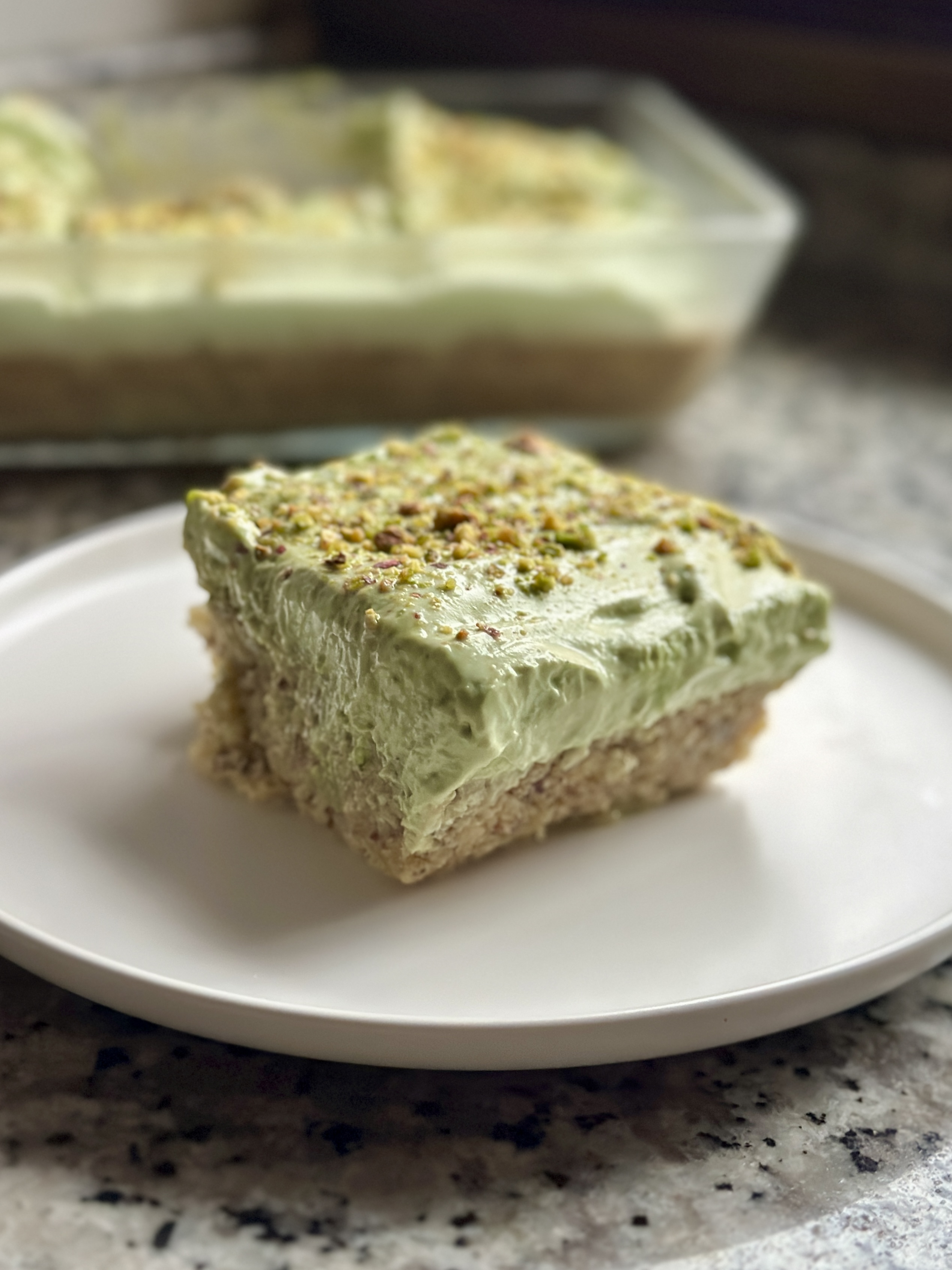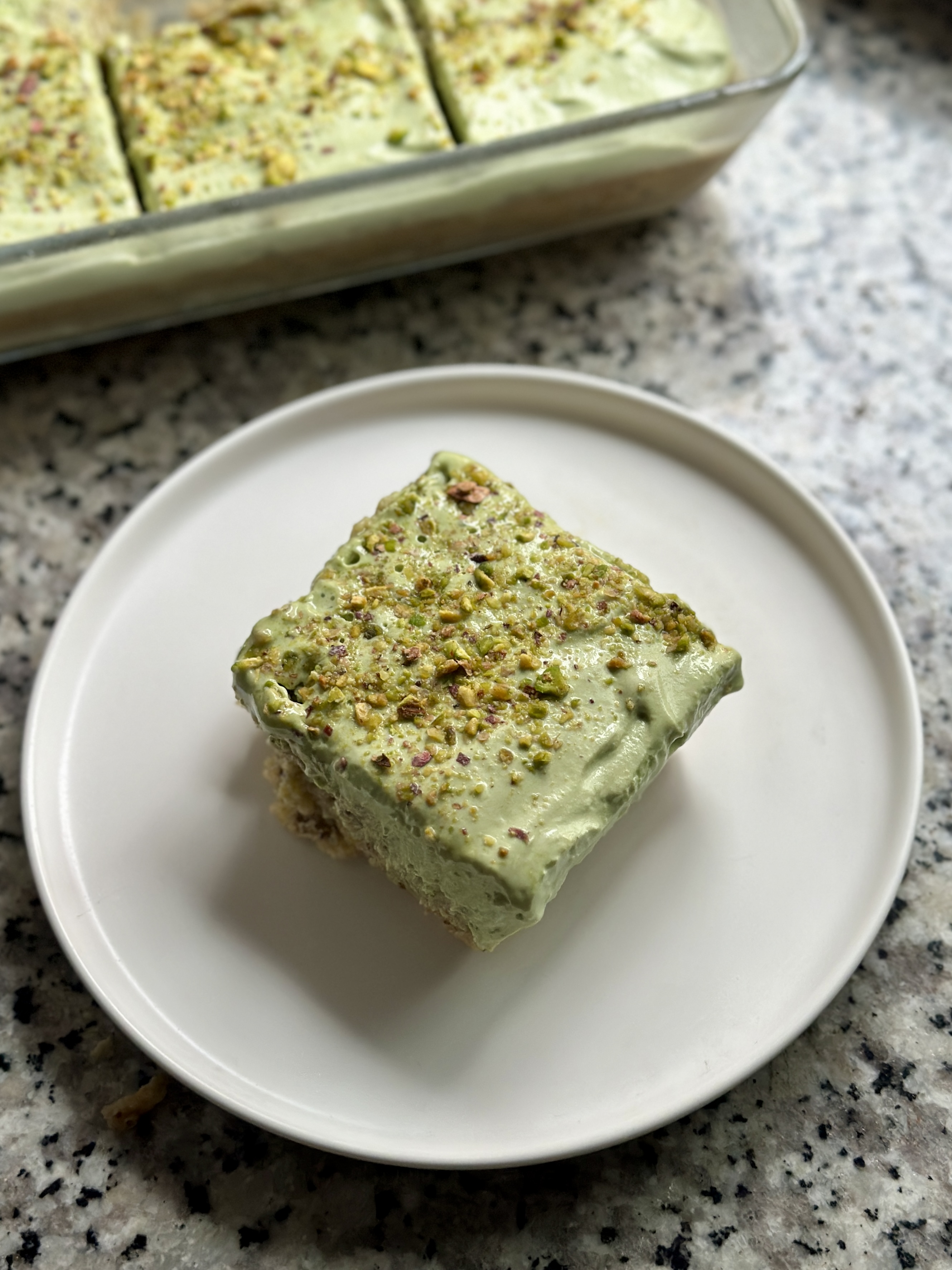 Moist, dairy-free pistachio tres leches cake made with a vegan 3-milk mixture, topped with dairy free whipping cream. Perfect for any occasion!