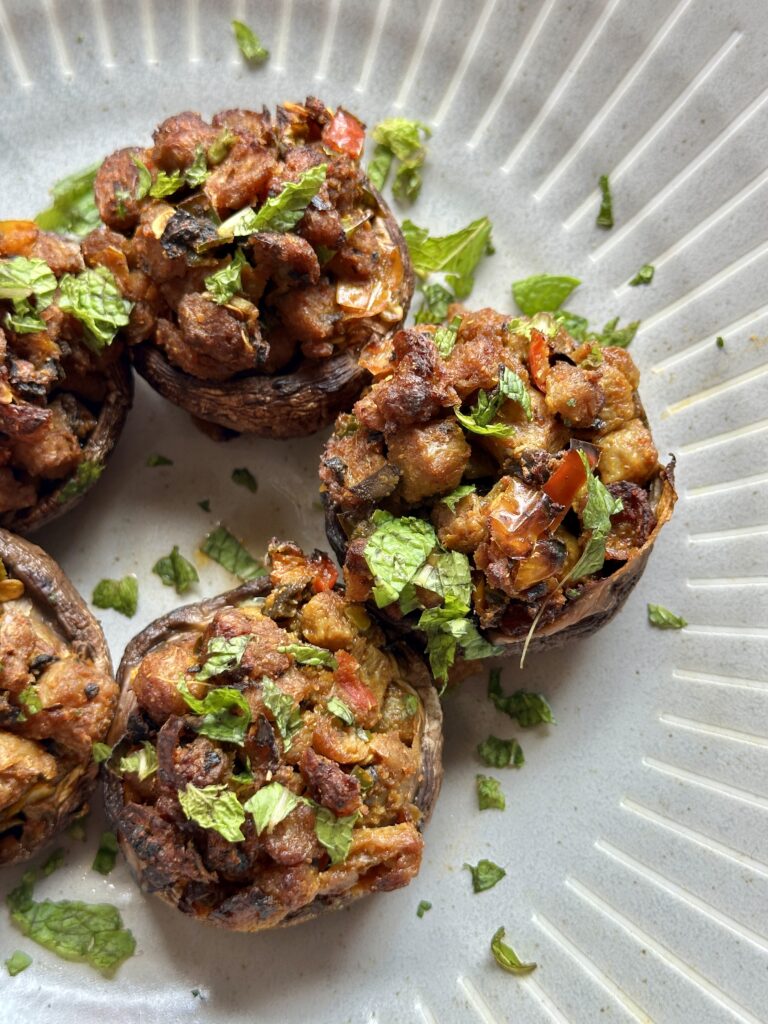• Stuff the filling into the mushrooms and air fry for about 5-8 minutes until mushrooms are cooked. Top with chopped coriander or mint. Enjoy!