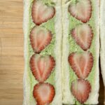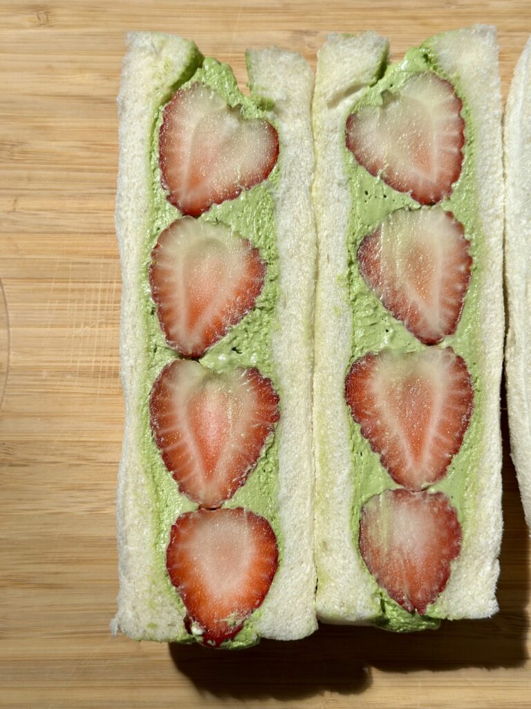 Fruit sandos are a popular type of sandwich in Japan and they’re made by layering fresh fruit and lightly sweetened whipped cream between soft, fluffy white bread – usually a Japanese milk bread called shokupan. These sandwiches usually have beautiful cross-sections like this strawberry matcha sando.