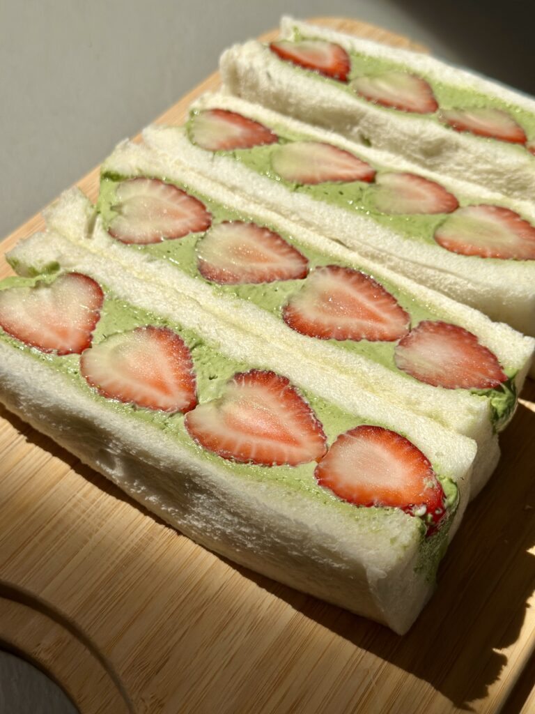 - Layout two slices of bread. Spread a thick, even layer of matcha cream on one slice. Arrange strawberries in a line or pattern diagonally.