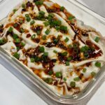 A hearty dumpling lasagne layered with dumpling wrappers, juicy vegan filling topped with chili oil sauce and spring onions.
